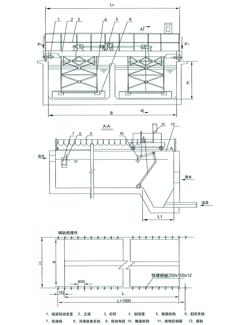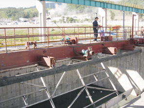 該設備采用移動橋式,當刮泥機不工作時,即停在進水端;當刮泥機工作時,順水流行駛時,先放下撇渣板,將池面浮渣撇向池端鋼制撇渣槽內,而刮泥板被提離池底;反向行駛時,放下刮泥板將池底污泥刮向池端集泥槽內,而撇渣板被提起,離開液面以防浮渣逆行;依此作往返工作運動,從而達到刮泥、撇渣的目的。