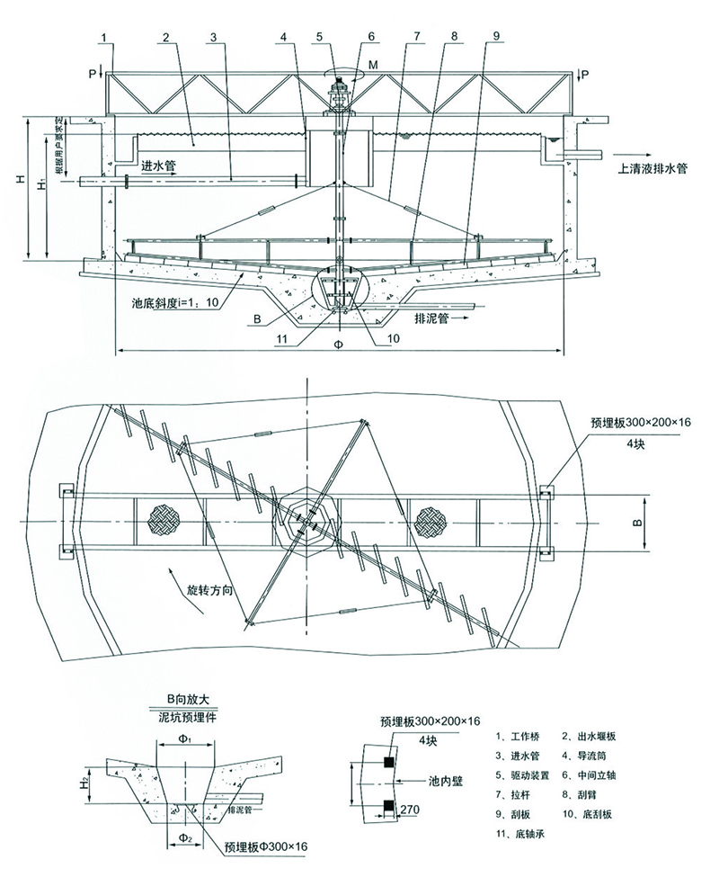 該設備采用中心傳動,污水從工作橋下流入水管,經導流筒擴散后,均勻地向周邊呈輻射狀流出。呈懸浮狀的污泥經沉淀后沉積于池底,驅動裝置帶動中心立軸旋轉,并帶動刮臂及刮泥機板轉動,刮板將污泥刮集后由吸泥管依靠池內靜水壓抽吸至集泥槽內排入中心泥缸,再通過中心排泥管排出池外,水面的浮渣通過旋轉撇渣裝置導入排渣斗內排出池外,而上清液則通過三角形出水堰板溢入出水槽內排出。